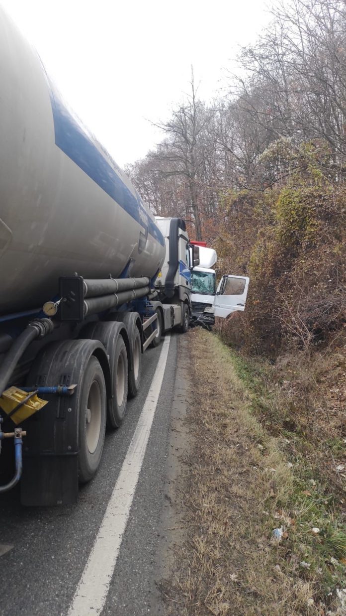 Două mașini de mare tonaj s-au ciocnit, astăzi, în satul Poienari – Bumnești Puțic, iar în urma acestui accident unul dintre șoferi a rămas încarcerat.
