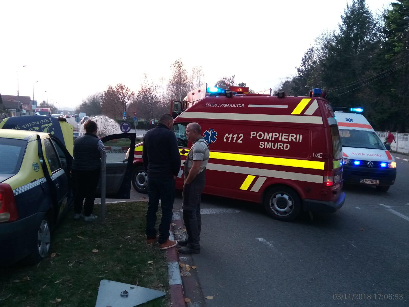 Un taxi s-a ciocnit cu o mașină, în urmă cu puțin timp, la sensul giratoriu din apropierea parcului Coloana Infinitului. Primele informații arată că un bărbat, pasager în taxi, a fost rănit, în urma impactului.