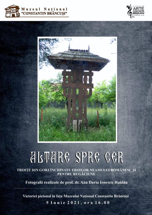 În data de 9 iunie, începând cu ora 16:00, în fața Muzeului Național ”Constantin Brâncuși” va fi putea fi admirată o expoziție de fotografie intitulată ”Altare spre cer”. Expoziția cuprinde 35 de fotografii cu troițe din Gorj, realizate de Ana Daria Ionescu Haidău. ”Cu prilejul sărbătorii Înălțării Domnului Iisus Hristos la ceruri și a Zilei Eroilor neamului românesc, voi expune în fața Muzeului Național ”Constantin Brâncuși” 35 de fotografii cu troițe, realizate în urma documentării privind lucrarea de doctorat cu titlul ”Monumente de for public – Troițe din Gorj” (2010-2014). Expoziția se intitulează ”Altare spre cer” și cuprinde troițe inchinate Eroilor din Gorj și troițe pentru închinăciune. Troiţa este o emblemă a identităţii noastre. Este nu doar un simbol al rezistenţei noastre în furtuna istoriei, ci și semnul jertfelor care au făcut posibilă dăinuirea acestui neam, temelia pe care s-a clădit demnitatea lui”, a anunțat aceasta.