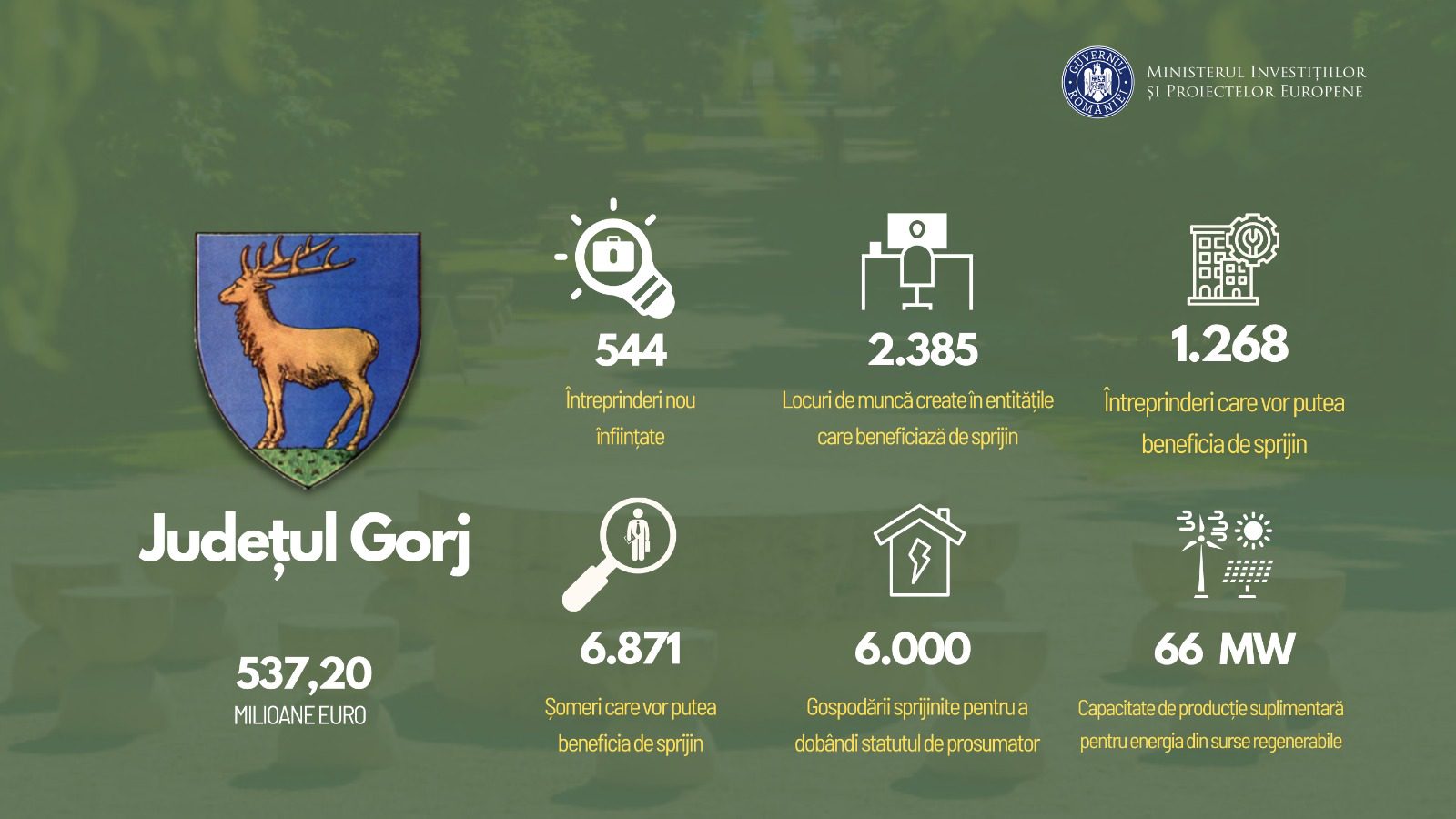 Până la această dată, 70 de întreprinderi mici și mijlocii din Gorj au proiecte eligibile, finanțate prin acest fond, „ceea ce reprezintă o realizare semnificativă pentru dezvoltarea economică județeană și regională”, mai spune Rujan.