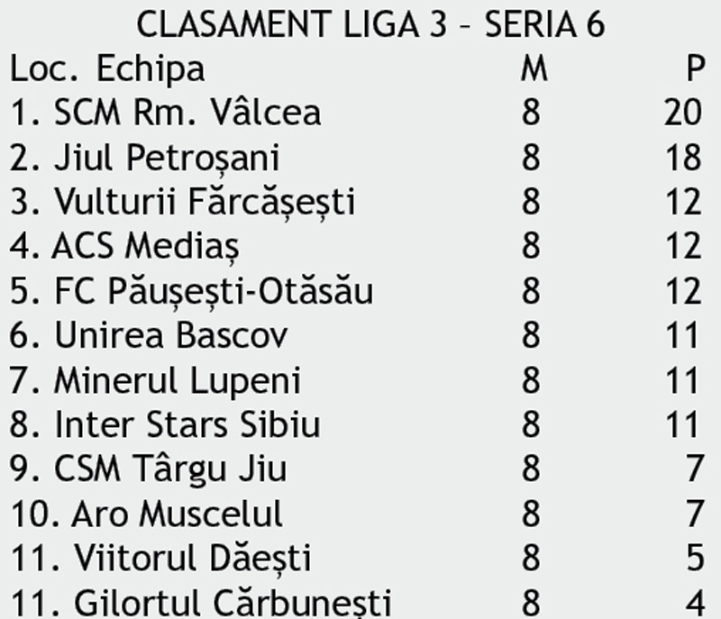 CSM Târgu Jiu trebuie să-și consolideze prestația solidă din meciul cu SCM Râmnicu Vâlcea cu un nou rezultat bun în deplasarea de la Muscelul Aro Câmulung, formație care a acumulat tot 7 puncte după cele opt runde scurse din Liga 3. Meciul se dispută sâmbătă, de la ora 15.00. Antrenorul Mario Găman a declarat că trupa gorjeană trebui să mențină aceleași coordonate din meciul cu liderul seriei. Tehnicianul a mai spus că poziția celor două echipe este mincinoasă, iar adversara din weekend are un lot puternic, care se va bate pentru intrarea în play-off.