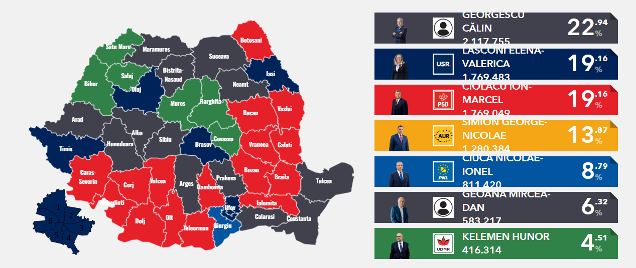 Elena Lasconi are cu 434 de voturi mai multe decât a obținut Marcel Ciolacu, potrivit centralizării a 99,93% din procesele-verbale. La acest moment, în finala prezidențială, dacă nu vor mai suferi modificări importante, rămân Călin Georgescu și Elena Lasconi.