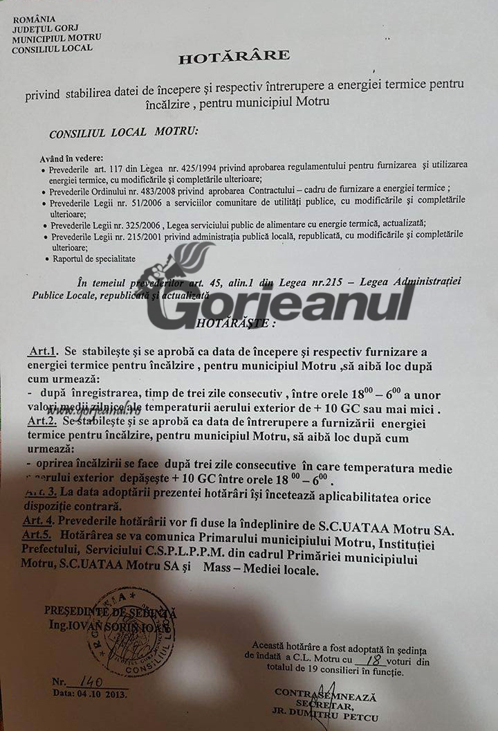 Situație fără precedent, în aceste zile, în municipiul Motru unde 6000 de locuințe, cartierele de case, instituțiile, școlile și spațiile agenților economici sunt înghețate, populația fiind obligată să tremure de frig și acasă, și la școală, dar și la locul de muncă, pentru că primarul localității a decis să dea drumul la căldură abia de luna viitoare. Mai exact, pentru ca populația să nu rămână fără apa caldă, edilul Gigel Jianu a decis să facă reviziile la UATAA abia după data de 20 octombrie, motivând că stocurile uzinei de agent termic nu ar permite pornirea centralei mai devreme de 27 octombrie. “Prognoza din vară pentru octombrie era că luna va fi una călduroasă. Licitația pentru păcură este pe 24 octombrie. Cei doi administratori ai UATAA, cel special și cel judiciar, se ocupă de tot ce ține de uzină”, a declarat primarul Jianu.