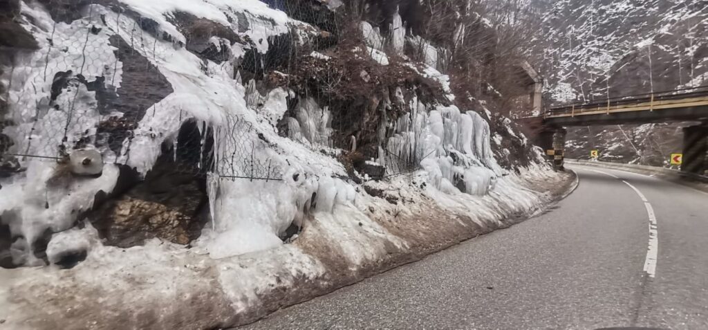 Echipele SDN Târgu Jiu intervin pe DN 66, în Defileul Jiului, pentru îndepărtarea gheții formate pe versanți, din cauza apei provenite din topirea zăpezii, care se scurge și îngheață la temperaturi scăzute.