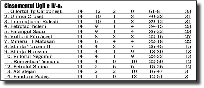 În rest, runda a fost una a gazdelor, care n-au pierdut niciun meci, oaspeții mulțumindu-se doar cu trei remize, performerele fiind Unirea Crușeț, Vulturii Fărcășești și Știința Hurezani.