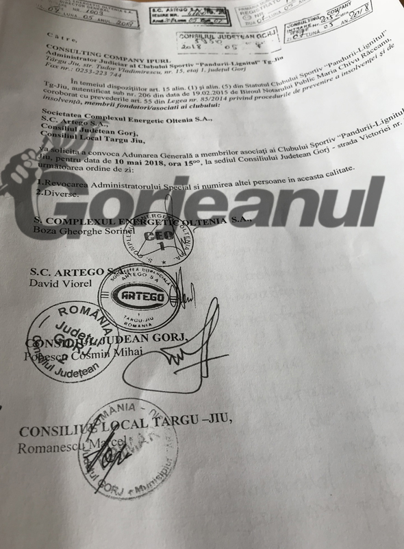 Patru din cei cinci membri asociați de la Pandurii i-au cerut administratorului judiciar al clubului convocarea unei ședințe a Adunării Generale care să aibă ca singur punct pe ordinea de zi îndepărtarea din funcția de administrator special a lui Marin Golea. Cererea a fost formulată la începutul săptămânii, iar ieri administratorul judiciar Emanoil Ciobanu a făcut adrese către toți acționarii clubului că ședința este convocată pentru azi la ora 15.00 cu ordinea de zi solicitată. Culmea este că cererea este formulată și de către Artego, societate care la începutul anului anunța că se retrage de la Pandurii. Doar Uniunea Sindicatelor Miniere Oltenia nu susține demersul respectiv, în rest, Complexul Energetic Oltenia, Consiliul Județean și Consiliul Local fiind pentru schimbarea lui Golea.