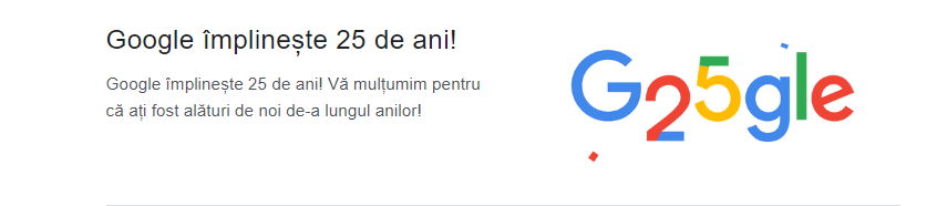 Google a marcat sărbătorirea celor 25 de ani de existență printr-un Doodle special, reflectând evoluția și impactul companiei în lumea digitală. Doodle-ul celebrează nu doar aniversarea, ci și misiunea constantă a Google de a organiza informațiile lumii și a le face accesibile și utile pentru toți.