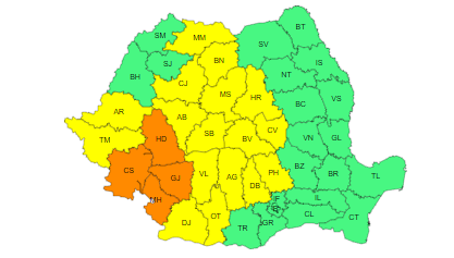 ANM: În sudul Banatului, nord-vestul Olteniei și în sud-vestul Transilvaniei, vor fi perioade cu averse torențiale intensificări ale vântului și pe arii restrânse vijelii (rafale de 70…90 km/h), grindină și descărcări electrice. În intervale scurte de timp (1…3 ore) sau prin acumulare cantitățile de apă vor fi de 25…40 l/mp și pe arii restrânse de peste 50…70 l/mp.