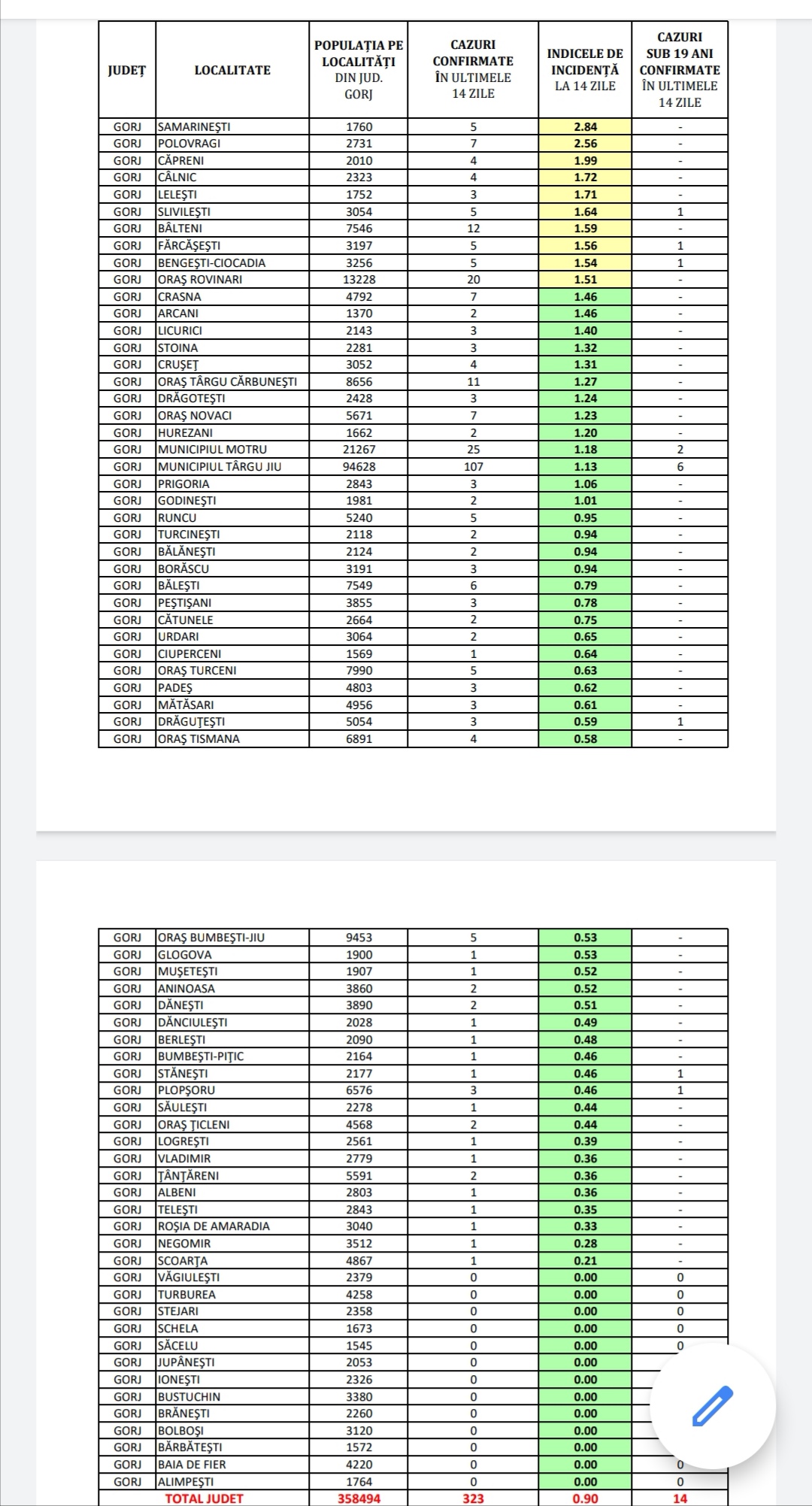 Gorj: Incidența cazurilor de COVID-19, pe localități