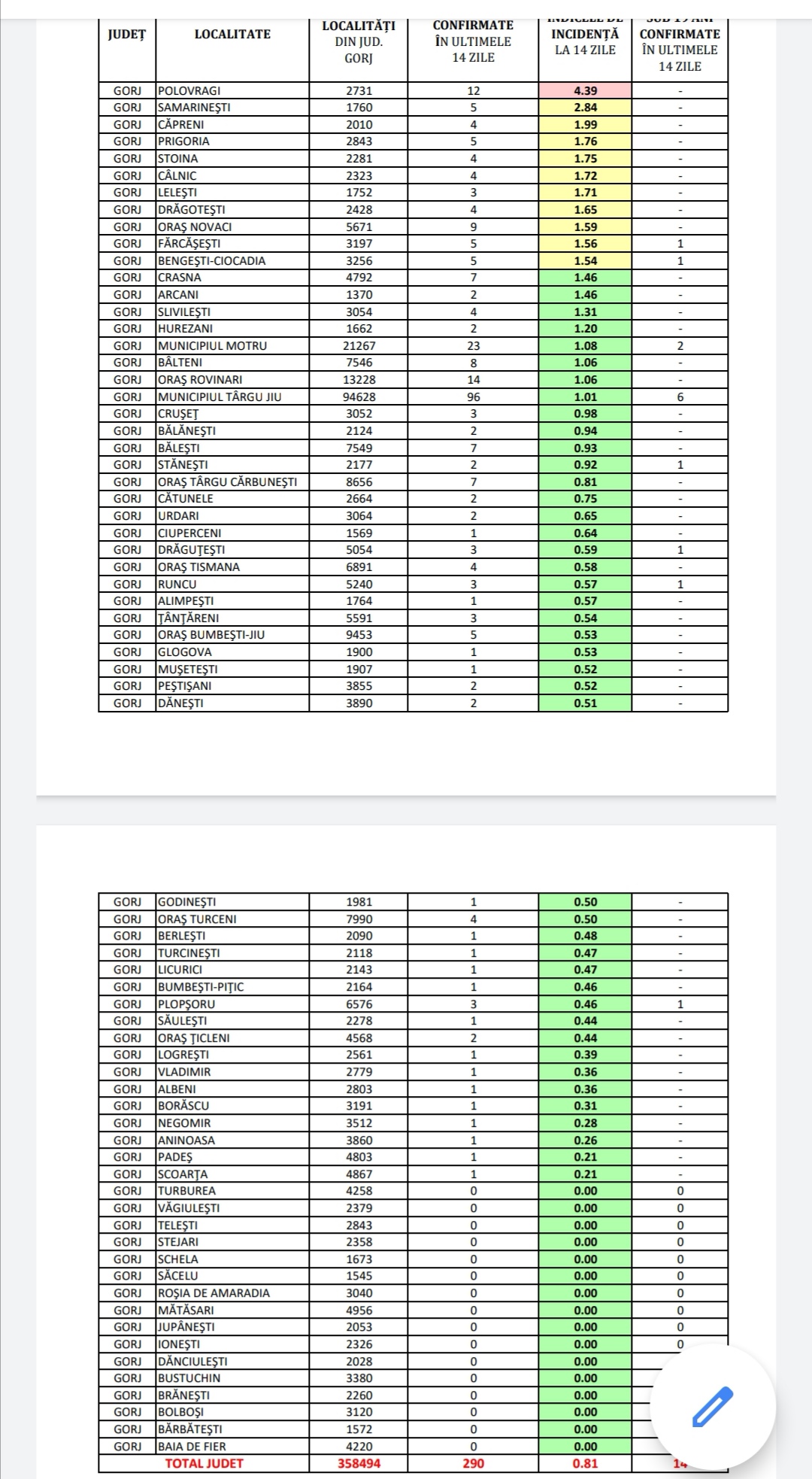 Gorj: Incidența cazurilor de COVID-19, pe localități