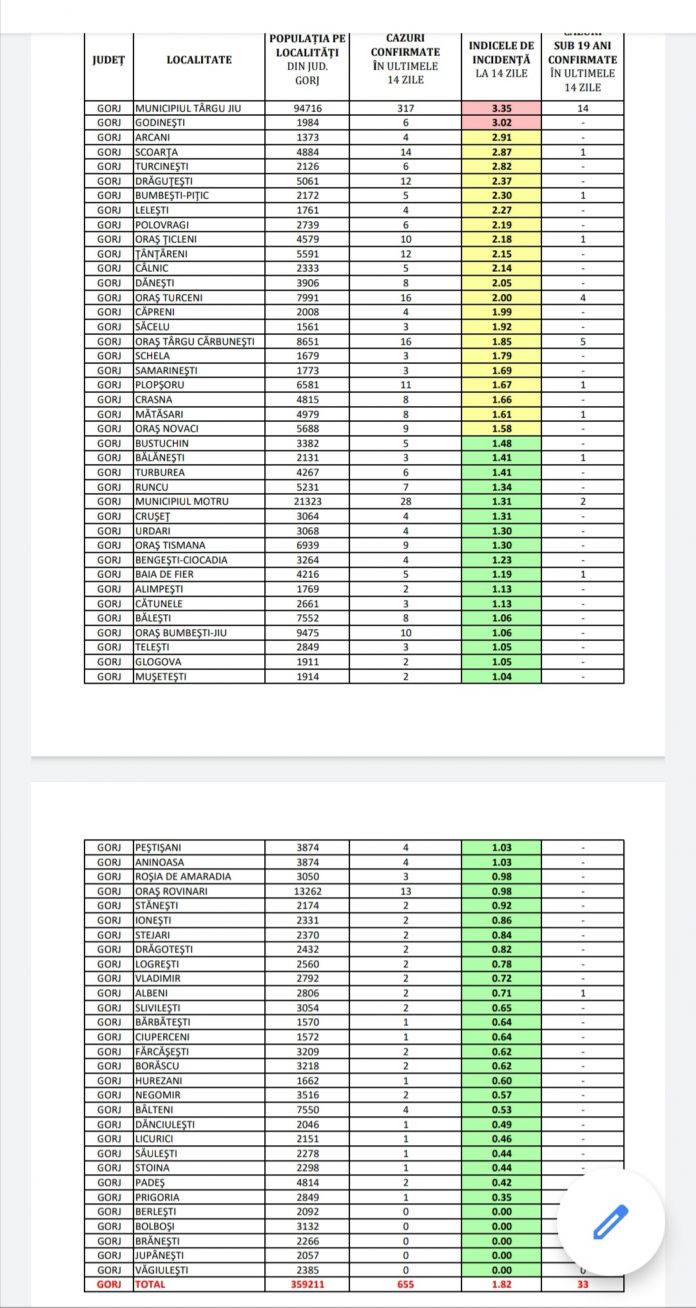 Gorj: Incidența cazurilor de COVID-19, pe localități