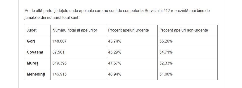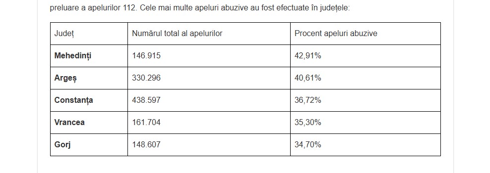Totodată, cele mai multe apeluri abuzive au fost efectuate în județele Mehedinți (42,91%), Argeș (40,61%), Constanța (36,72%), Vrancea (35,30%) și Gorj (34,70%).