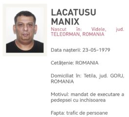 Polițiștii din cadrul Serviciului de Investigații Criminale au transmis autorităților judiciare din Regatul Unit al Marii Britanii informații care, la data de 14 ianuarie, au condus la depistarea unui alt bărbat de 46 de ani, din orașul Bumbești-Jiu, localitatea Tetila, acesta fiind condamnat de Tribunalul Gorj la o pedeapsă de 10 ani și 2 luni închisoare pentru săvârșirea infracțiunilor de trafic de minori și proxenetism. Gorjeanul era inclus în categoria MOST WANTED.