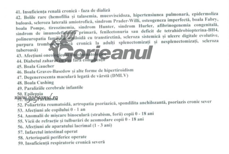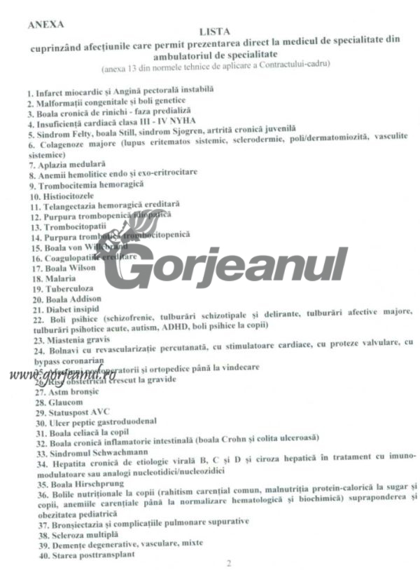Printre afecțiunile care nu îi mai obligă pe gorjeni să treacă întâi pe la medicul de familie, înainte de a ajunge la specialist, sunt cele oncologice, diabetul, hepatita cronică, astmul bronșic, dar și afecțiunile copiilor mai mici de un an. În plus, în listă mai sunt afecțiuni precum: infarct miocardic sau angină pectorală instabilă, malformații congenitale și boli genetice, boală cronică de rinichi (faza predializă), malaria, tuberculoza, bolile psihice, afecțiunile postoperatorii.