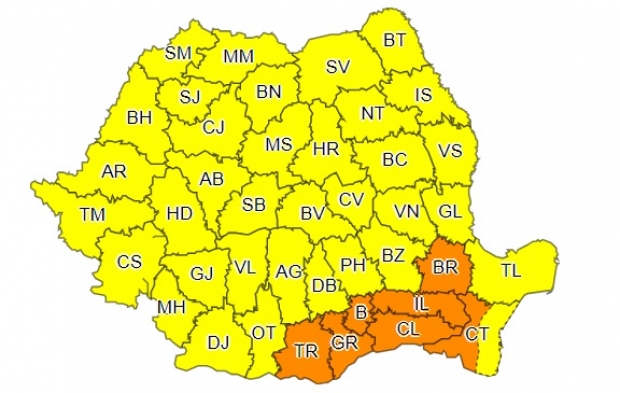 Meteorologii au emis Cod galben de căldură şi disconfort termic ridicat pentru majoritatea județelor din țară. În schimb, judeţele Teleorman, Giurgiu, Călăraşi, Ialomiţa, Brăila, Constanţa, Ilfov şi municipiul Bucureşti se vor află sub Cod portocaliu de caniculă.
