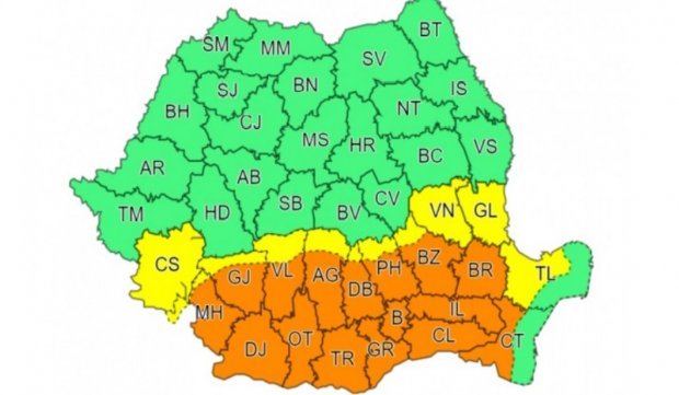 Sunt sub avertizare Cod portocaliu județele Mehedinți, Gorj, Dolj, Vâlcea, Olt, Argeș, Teleorman, Giurgiu, Dâmbovița, Prahova, Ilfov, Buzău, Brăila, Ialomița, Călărași și Constanța.