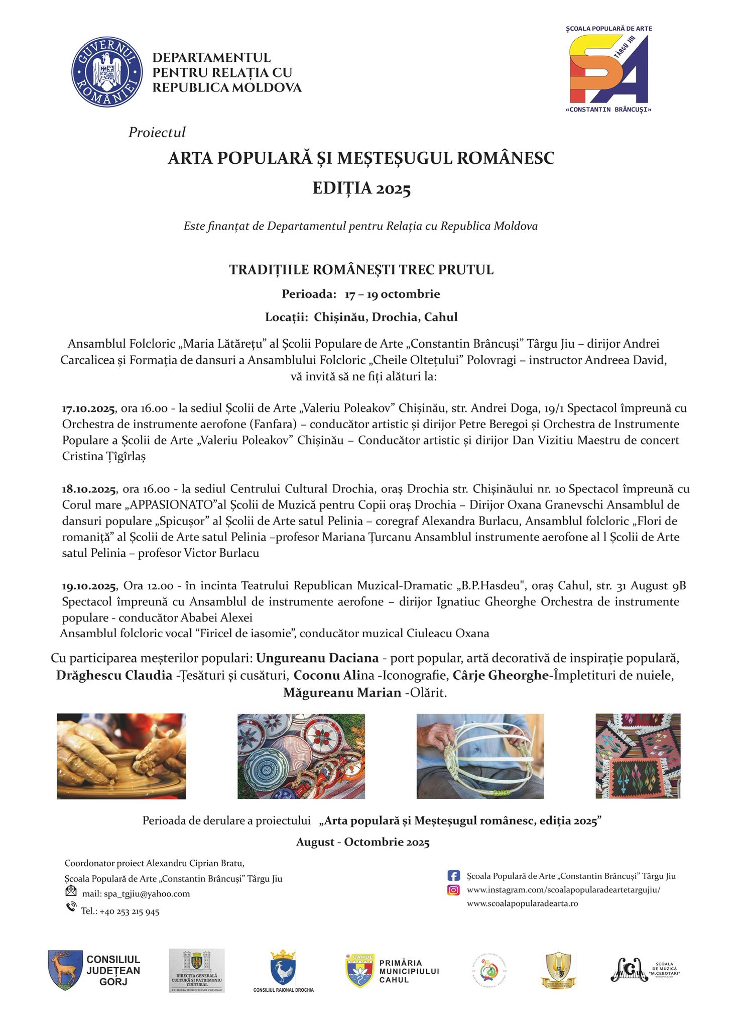 În perioada 17-19 octombrie a.c., Școala Populară de Arte „Constantin Brâncuși” Târgu Jiu derulează, în parteneriat cu Direcția Cultură și Turism Drochia, Școala de Arte „Valeriu Poleakov” din Chișinău și Școala de Muzică „Maria Cebotari” din Cahul, proiectul „Arta populară și Meșteșugul românesc, ediția 2025”.