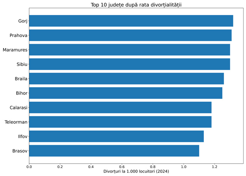 Imediat după Gorj se situează Prahova, cu o rată de 1,31 divorțuri la mia de locuitori, urmat de Maramureș și Sibiu, fiecare cu aproximativ 1,30. În top se mai regăsesc Brăila și Bihor, unde rata depășește 1,25, dar și Călărași, Teleorman, Ilfov și Brașov.