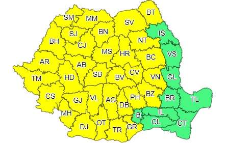 Judeţele vizate de Codul galben sunt: Alba, Argeş, Arad, Bacău, Bihor, Bistriţa-Năsăud, Botoşani, Braşov, Buzău, Cluj, Caraş-Severin, Covasna, Dâmboviţa, Dolj, Gorj, Giurgiu, Hunedoara, Harghita, Mehedinţi, Maramureş, Mureş, Neamţ, Olt, Prahova, Sibiu, Sălaj, Satu Mare, Suceava, Timiş, Teleorman, Vâlcea şi Vrancea.