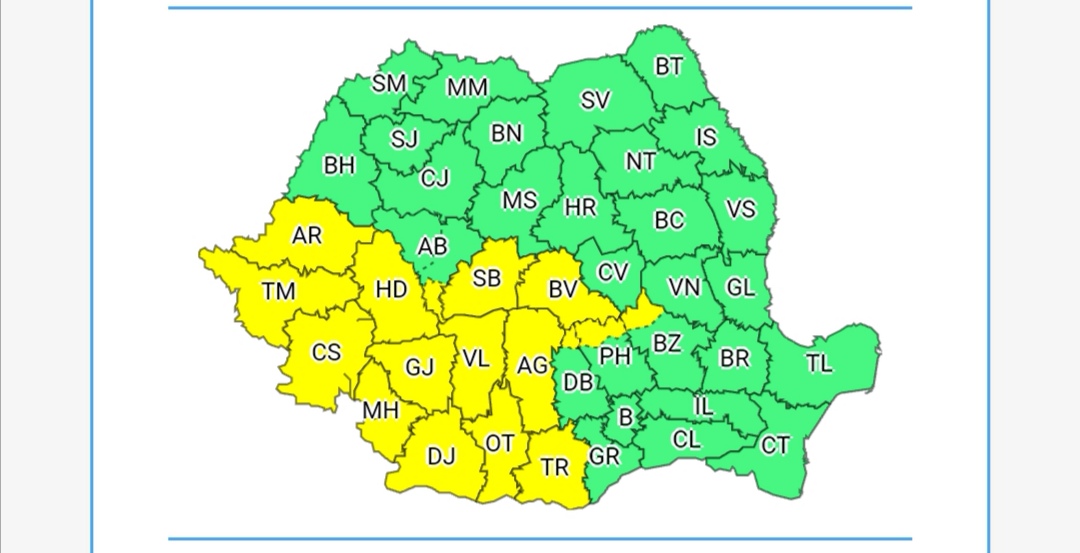 În vestul și sud-vestul teritoriului va ploua, iar în județele Arad, Timiș, Caraș-Severin și Mehedinți, ploile vor avea și caracter torențial și se vor acumula cantități de apă ce vor depăși local 25 l/mp și izolat 40 l/mp.