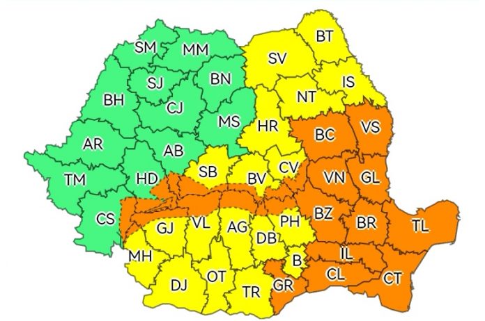 În județele Giurgiu, Călărași, Ialomița, Brăila, Tulcea și Constanța vor fi precipitații abundente, se vor acumula 50…60 l/mp și izolat 70 l/mp.