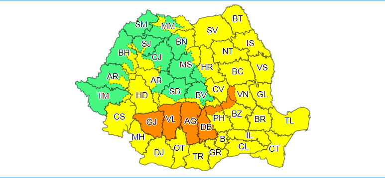 Notă: manifestări de instabilitate atmosferică accentuată vor fi pe alocuri și în celelalte județe din sudul și estul țării.