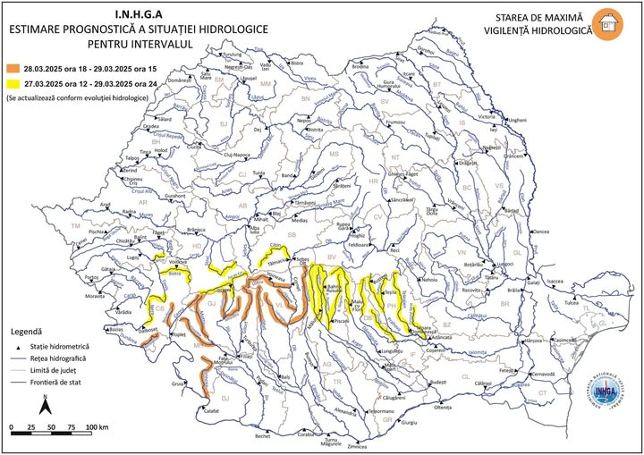Același cod va fi activ și în intervalul 28.03.2025 ora 12:00 – 29.03.2025 ora 24:00, pe râuri din județele: Argeş, Dâmboviţa, Prahova, Ilfov şi Ialomiţa.