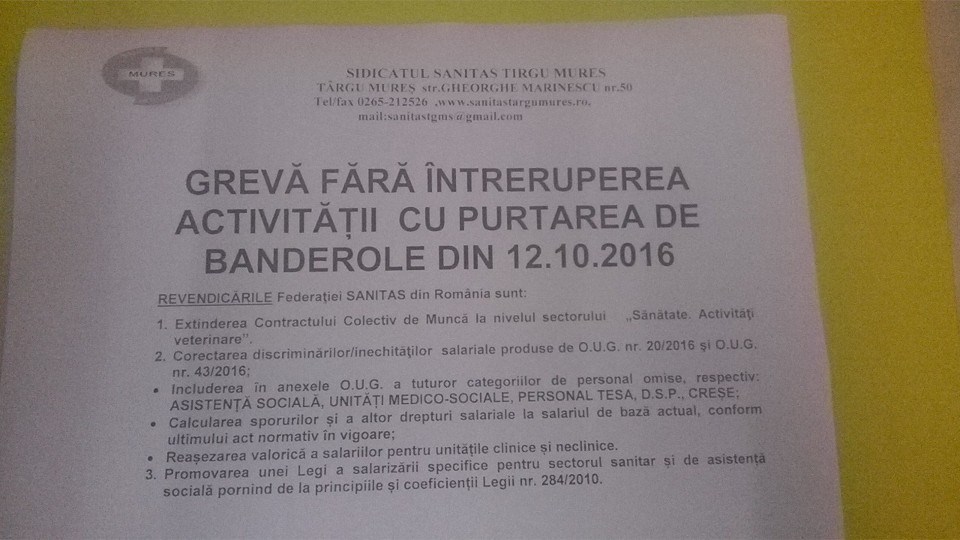 Zeci de mii de membri ai Federaţiei SANITAS au fost, miercuri, în grevă japoneză, ei urmând ca, peste o săptămână, să intre în grevă de avertisment cu întreruperea activităţii timp de două ore, iar în 31 octombrie să declanşeze o grevă generală pe perioadă nedeterminată. Valentin Popa, președintele SANITAS Gorj, spune că între revendicările sindicale se regăsește corectarea inechităților salariale, dar și includerea în OUG a tuturor categoriilor de personal omise, respectiv: asistență socială, unități medico-sociale, personal TESA, creșe, DSP și altele.