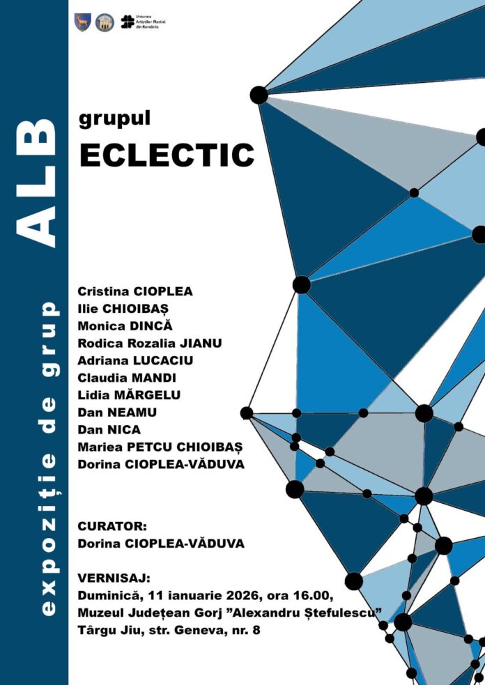 În această după-amiază, de la ora 16.00, la Muzeul Județean Gorj ”Alexandru Ștefulescu” din Târgu Jiu va avea loc vernisajul expoziției de arte vizuale ”Alb” a grupului ECLECTIC, format din artiștii Cristina CIOPLEA, Ilie CHIOIBAȘ, Monica DINCĂ, Rodica Rozalia JIANU, Adriana LUCACIU, Claudia MANDI, Lidia MĂRGELU, Dan NEAMU, Dan NICA, Mariea PETCU CHIOIBAȘ, Dorina CIOPLEA-VĂDUVA.