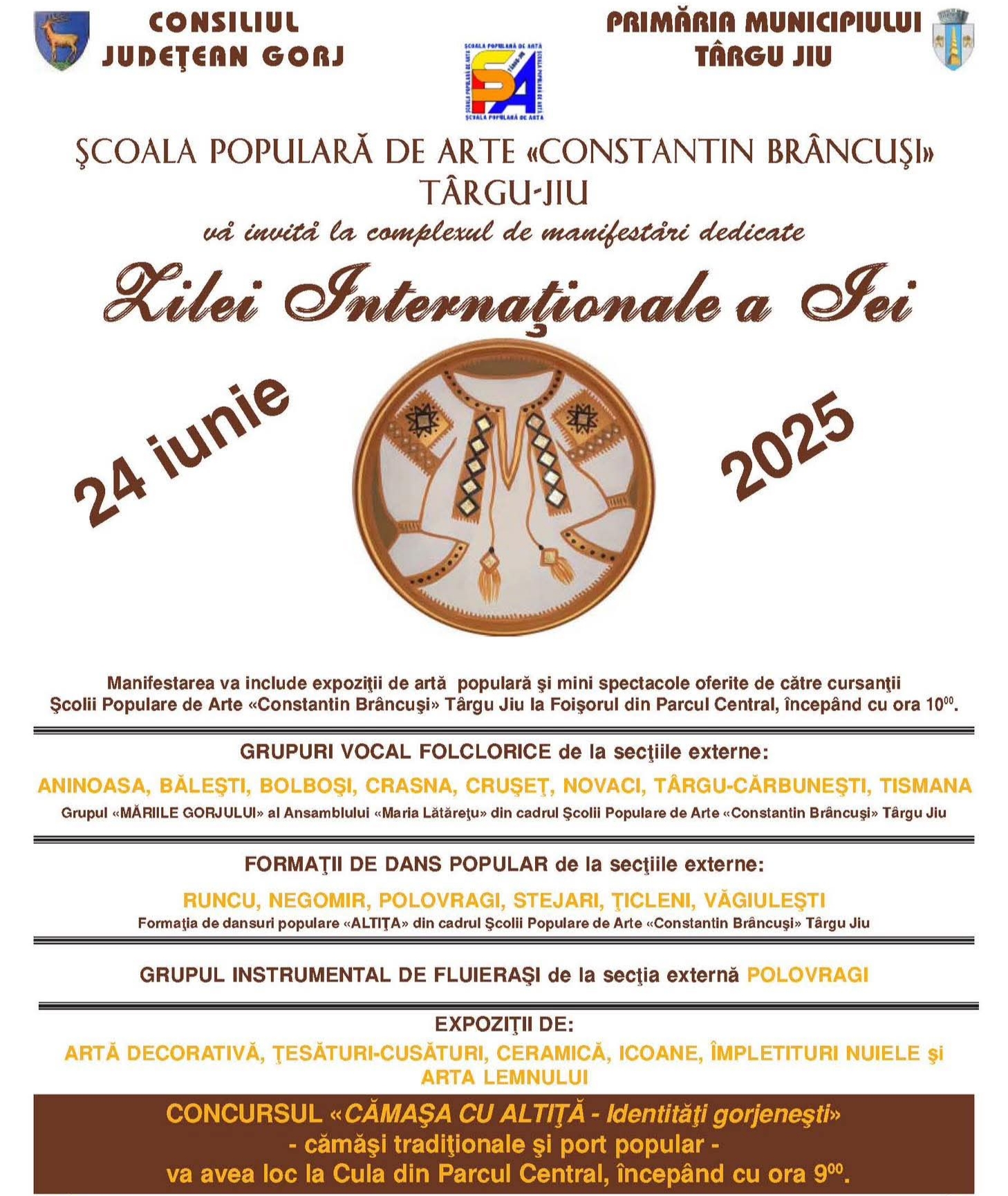 Mâine, 24 iunie 2025, Parcul Central din Târgu Jiu se va transforma într-o scenă a tradițiilor autentice, odată cu organizarea unui amplu eveniment dedicat Zilei Internaționale a Iei, sub genericul „Cămașa cu altiță – Identități gorjenești”.