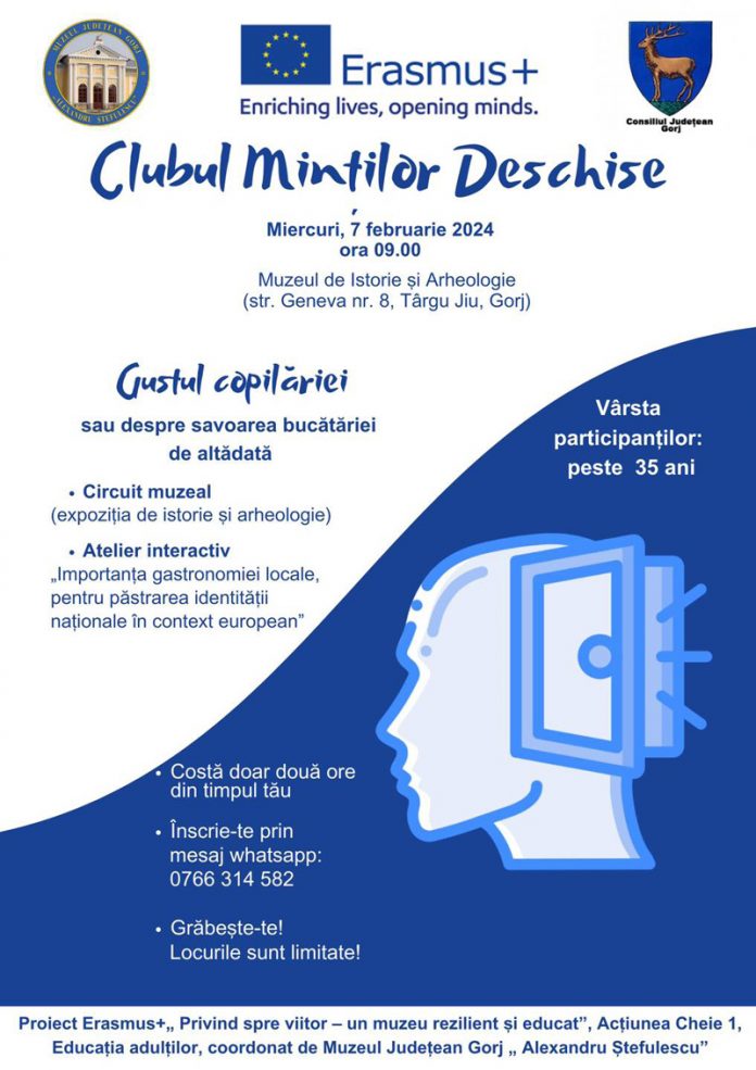 Muzeul Județean Gorj „Alexandru Ștefulescu” continuă activitățile din Clubul Minților Deschise, care are în dezbatere o nouă temă: „Gustul copilăriei, sau despre savoarea bucătăriei de altădată”. Activitatea va avea loc mâine, 7 februarie, începând cu ora 09:00, la sediul muzeului, din strada Geneva nr. 8, Târgu Jiu, și are în program: – vizitarea expoziției de istorie și arheologie, cu accent pe modul de preparare a hranei pe teritoriul județului Gorj, din Preistorie până în Epoca Contemporană; – atelierul interactiv „Importanța gastronomiei locale, pentru păstrarea identității naționale în context european”. Participarea este gratuită, cu înscriere pe whatsapp, la numărul de telefon 0766314582. Vârsta minimă a participanților este 35 de ani. Programul Clubul Minților Deschise face parte din proiectul Erasmus+ „Privind spre viitor – un muzeu rezilient și educat”, din cadrul Acțiunii cheie 1, Educația adulților, coordonat de Muzeul Județean Gorj „Alexandru Ștefulescu”.