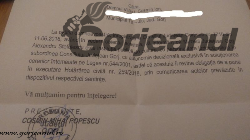 adresat Muzeului Județean Gorj cu o cerere pe Legea 544 privind accesul la informații publice prin care solicita contractul încheiat între instituție și Gheorghe Calotoiu, acesta fiind nedumerit de faptul că respectivul salariat era pensionar, iar alte posturi din unitate erau desființate. Cum ar fi, de exemplu, postul de carte veche. Reprezentanții instituției au refuzat însă comunicarea informației, în termenul legal, fapt pentru care au fost acționați în instanța de contencios administrativ. Când au primit citația de la Tribunalul Gorj, muzeul a motivat că nu poate să comunice un asemenea document, întrucât ar conține date personale și drepturi de autor, același lucru comunicându-l și instanței de judecată. Instanța de judecată a emis însă o adresă către muzeu solicitând respectivul document și analizându-l au constatat că acesta nu intră sub incidența Legii 544 și ca atare, au obligat instituția respectivă să comunice documentul solicitat. Tot atunci, instanța a precizat că nu este competentă să sancționeze administrativ sau cu amendă pe reprezentanții muzeului, care refuzau trimiterea către petent a documentului cerut, deși a consemnat că fapta reprezintă abatere disciplinară.