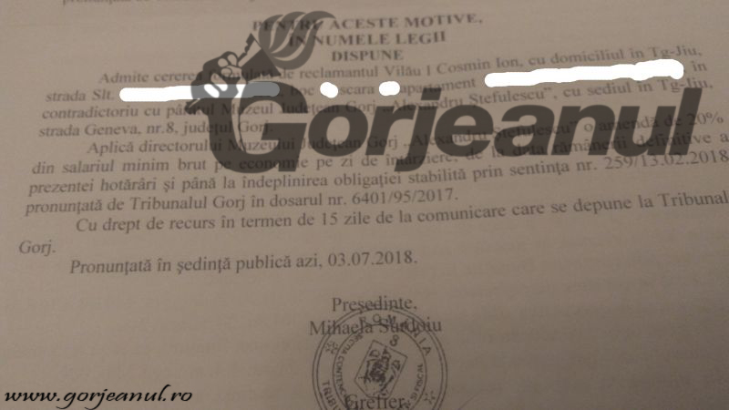 Dumitru Hortopan, directorul Muzeului Județean Gorj, a primit o sentință, săptămâna trecută, de la Curtea de Apel Craiova, care îl va arde la buzunar timp de câțiva ani de acum înainte. Totul, deoarece șeful instituției a refuzat să pună în aplicare o hotărâre judecătorească, care îl obliga să comunice unui profesor din municipiu contractul de muncă al lui Gheorghe Calotoiu, colaborator al instituției. Hortopan a declarat, marți, că așteaptă comunicarea sentinței, apoi va cere instanței achitarea amenzii judiciare eșalonat pentru următorii ani.
