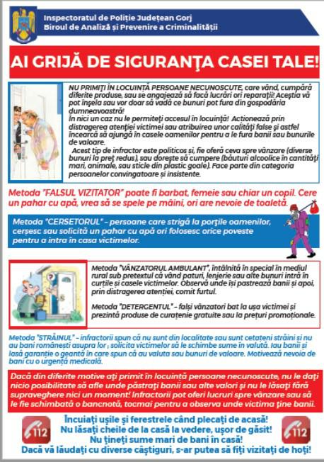”Pentru a nu deveni victime ale unor infracţiuni contra patrimoniului, Inspectoratul de Poliţie Judeţean de Poliţie Gorj vă recomandă să aveţi în vedere un minim de măsuri de autoprotecţie. Manifestaţi prudenţă şi verificaţi dacă ceea ce vi se comunică prin telefon este adevărat, prin apelare la serviciile de informaţii clienţi de la operator. Nu daţi dovadă de credulitate atunci când sunteţi contactat telefonic de persoane care pretind a fi reprezentanţi ai diferitelor firme. Nu permiteţi accesul în locuinţă sau curtea imobilului persoanelor necunoscute care se oferă să cumpere diverse bunuri – vor profita de neatenţia dumneavoastră şi ulterior veţi constata că v-au fost sustrase bunuri de valoare sau sume de bani.