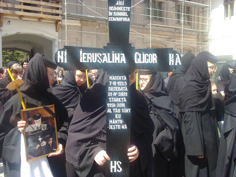 Aşa cum am precizat, sâmbătă, 24 aprilie 2021, Mănăstirea Tismana, lavra Sf. Nicodim, a îmbrăcat haine cernite în ziua prohodirii şi a ridicării la cer a Maicii Stareţe Ierusalima Gligor Stavrofora, în prezenţa a peste 300 de credincioşi, a unui sobor ales de preoţi şi călugări, alcătuit din ierarhi de frunte ai Eparhiei Olteniei, la care s-a adăugat prezenţa remarcabilă şi apreciată a Părintelui Prof. univ. dr. Constantin Necula, Prodecanul Facultăţii de Teologie Ortodoxă «Andrei Şaguna» din Sibiu, a maicilor stareţe amintite anterior, la care adăugăm şi numele maicilor stareţe Teodora Ilie de la Mănăstirea «Icoana», comuna Crasna, şi Ambrozia Rucăreanu, de la Mănăstirea Arnota. La slujba de prohodire, P.S. Nicodim, Episcopul Severinului şi Strehaiei a ţinut să sublinieze că în existenţa Mănăstirii Tismana au fost şi momente grele, când, în anul 1959, în urma decretului nr. 410, de tristă amintire, din cele 120 de maicii de la această mănăstire au mai rămas numai 25, restul au fost date afară! ,,A fost greu pentru Maica Ierusalima, a precizat Preasfinţia sa, pentru că maicile nu aveau haine cu care să plece acasă, de aceea, s-a dus la Târgu-Jiu şi cu ajutorul lui Dumnezeu şi prin bunăvoinţa unei doamne căreia îi murise soţul, a cumpărat haine pentru maicile mănăstirii. Uneori, Maica Ierusalima a mai spus şi «Nu», pentru că nu poţi să nu ai reţinere când trebuie să faci faţă unor momente grele! Maica Ierusalima a fost un bun administrator, o mare iubitoare de slujbă, dar, lucrul cel mai important este legat de crucea pe care şi-a ales-o, iar acest lucru să fie în atenţia tuturor, mai ales în vremurile de astăzi, când vrăjmaşul «lucrează» prin tot felul de mijloace, prin tentaţii care vin peste sărmanul om din toate părţile, pentru că se miră îngerii, când se întâmplă ca să vadă tineri care doresc să trăiască în feciorie toată viaţa! E important ca noi să pornim la drum, pentru că Dumnezeu ne aşteaptă, ne ajută, iar Maicii Ierusalima veşnică să-i fie pomenirea, Amin”!