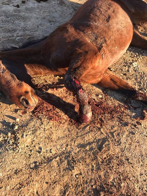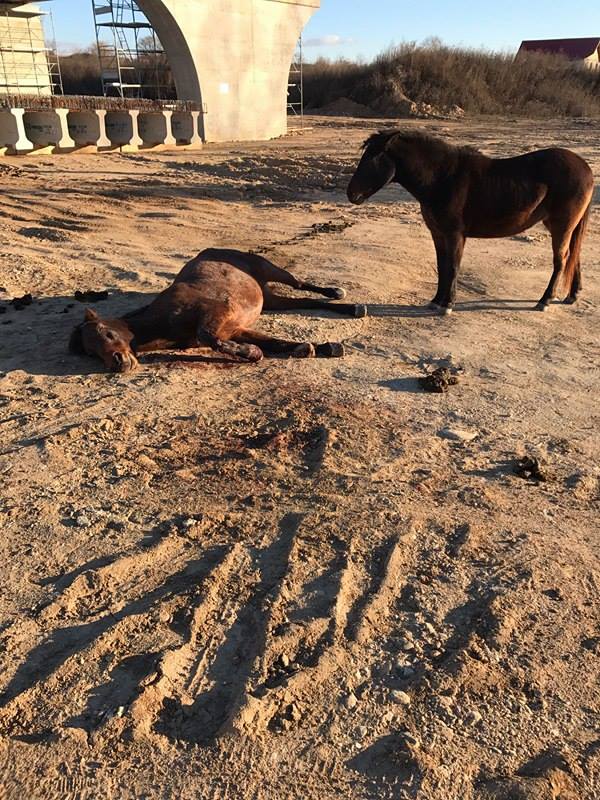 Calul rănit aseară, după ce a fost lovit de două autoturisme pe raza localității Drăgoieni, a fost lăsat în agonie. Acesta a fost îndepărtat de pe carosabil și se află și în acest moment în zonă, prăbușit la pământ, cu mai multe răni deschise.