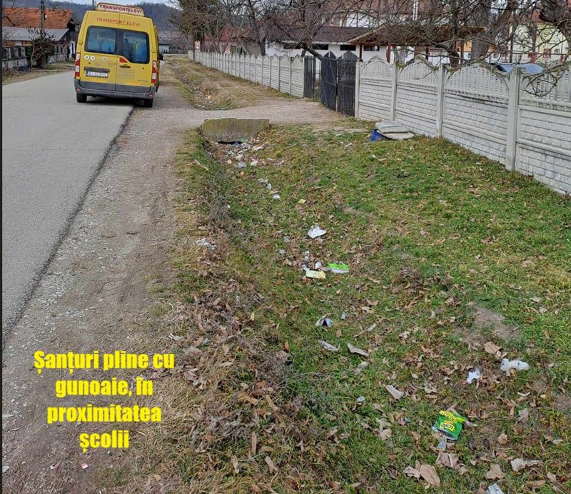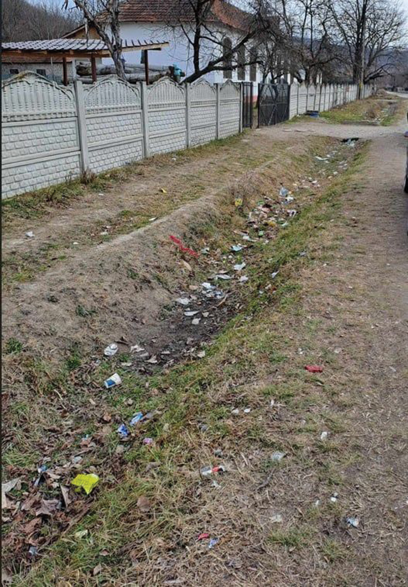 Peisajul în proximitatea școlii este dezolant, cu șanțuri pline de gunoaie și mizerie de nedescris, deși primăria a plătit, în septembrie 2023, aproximativ 30.000 de lei pentru eurocontainere din plastic care ar fi trebuit să fie montate în centrul satelor comunei.