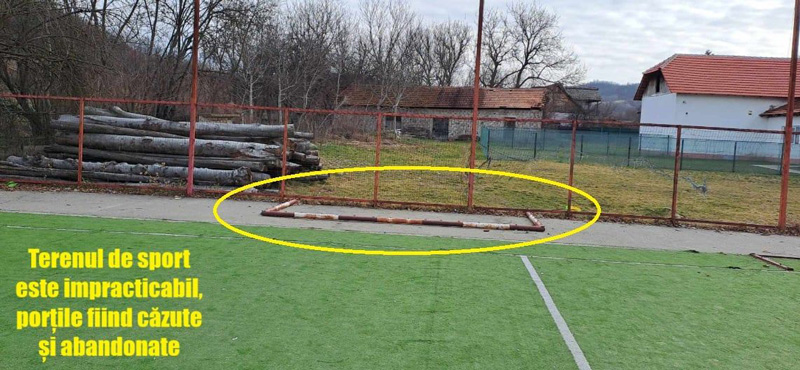 Terenul de sport de la școala din centrul comunei este într-o stare deplorabilă, cu mocheta ruptă și porțile căzute de mult timp, făcându-l impracticabil pentru copii. Clădirea în care funcționa sala de sport este foarte veche și de ani de zile plouă în ea, ceea ce face imposibilă desfășurarea activităților sportive.