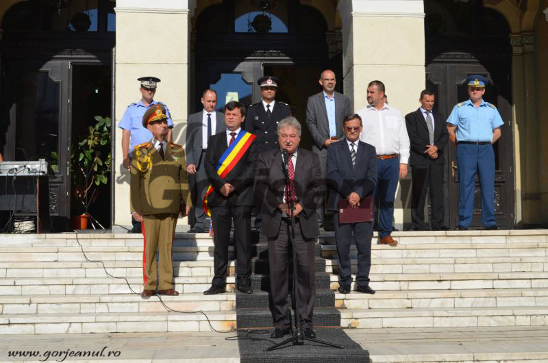 Gheorghe Nichifor, vicepreşedintele Consiliului Județean Gorj. A urmat intonarea Imnului Naţional al României, de către Yasmine Polacek și Fanfara Armonia, iar la final a avut loc Defilarea Gărzii de Onoare. Versurile imnului “Deşteaptă-te, române!” îi aparţin poetului Andrei Mureşanu şi au fost puse pe note de Anton Pann.
