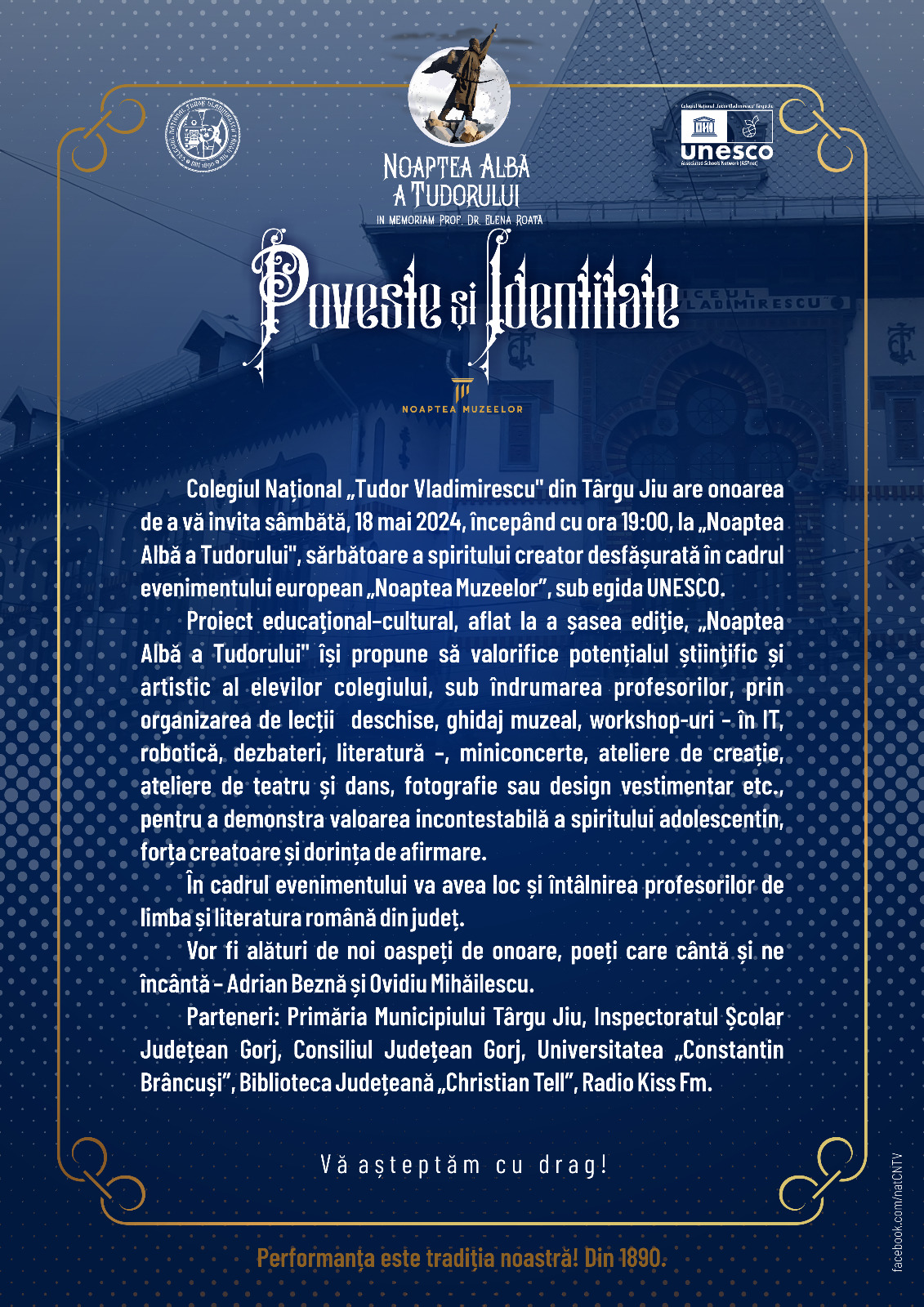 ”Noaptea Albă a Tudorului” este un eveniment cultural-științific-artistic, aflat la ediția a VI-a, organizat de Colegiul Național ”Tudor Vladimirescu”, in memoriam regretatului profesor dr. Elena Roată, mâine, 18 mai.