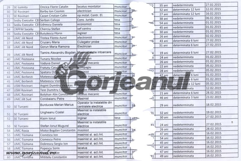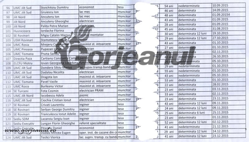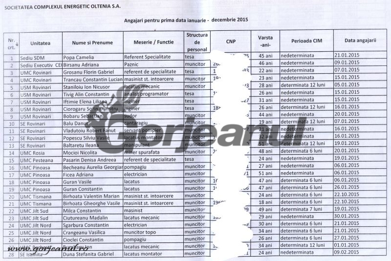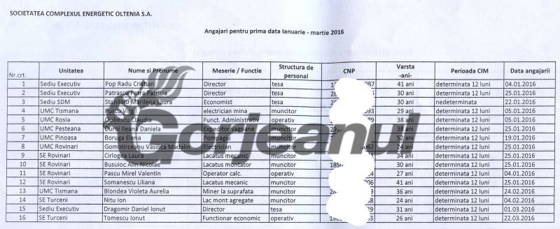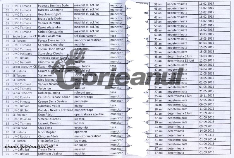 ceo (1) ceo (2) ceo (3) ceo (4) ceo (5)De altfel sub bagheta lui Ciurel este angajată la TESA UMC Peșteana, referent de specialitate, fiica fostului primar de Bâlteni, Gheorghe Păsărin. Denisa Andreea Păsărin, în vârstă de 24 de ani, lideră a femeilor PSD Bâlteni, este astfel angajată, pe 19 ianuarie, pe postul respectiv, din prima, pe perioadă nedeterminată. Asta deși, Ciurel la momentul respectiv se apără mințind că odrasla primarului luat cu cătușe de procurori a fost angajată pe perioadă determinată. Tot referent de specialitate este angajată și Popa Camelia, care aterizează direct la sediul SDM de la Târgu-Jiu, aceasta având data de angajare 21 ianurie 2015, și tot pe nedeterminată. Tesa de la USM Rovinari se îmbogățește în aceeași perioadă, 15-16 ianuarie 2015, cu trei salariați, mai exact cu Tivig Alin Constantin, analist programator la 26 de ani, angajat la USM Rovinari, cu Iftimie Elena Liliana, încadrată la 31 de ani inginer la aceeași unitate, dar și cu Ciorograru Sorin Dumitru, angajat inginer pe perioadă determinată de 12 luni la cariera amintită. Respectivul are 26 de ani și în același an figura admis la UCB Secția de Inginerie Energetică, cu taxă.
