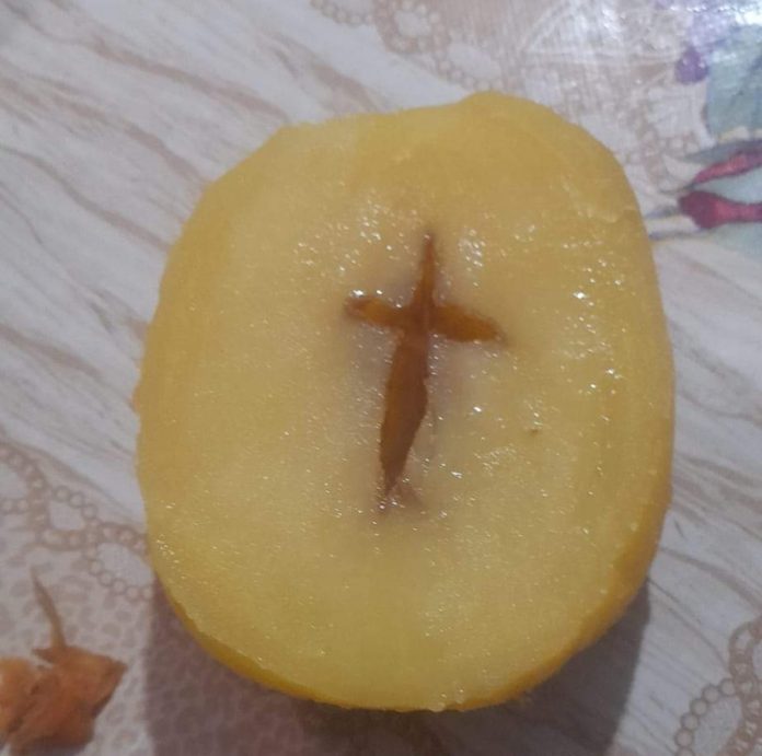 Fostul consilier local din Alimpești, Leonida Belgher, a făcut publică, ieri, o întâmplare care a stârnit nenumărate comentarii. Belgher a povestit că fiica familiei unde se afla, în timp ce tăia cartofi, a găsit în unul dintre ei o semnul crucii.