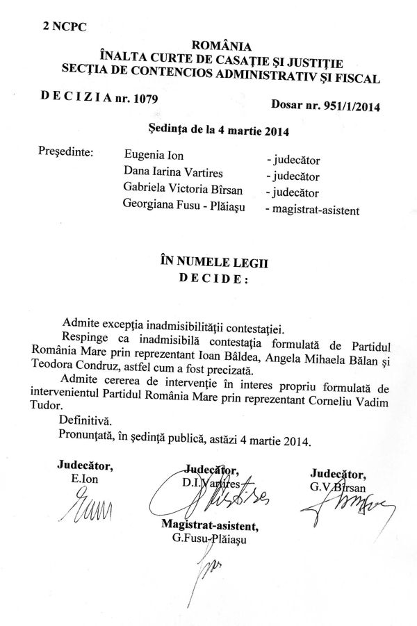 Deşi “puciştii” pierd de fiecare dată, aşa cum s-a întâmplat anul trecut în 28 noembrie la Tribunalul Bucureşti, ei sunt consecvenţi în reclamaţii. Mai nou, cei care-şi doresc cu orice preţ partidul lui Vadim, au reclamat la Înalta Curte de Casaţie şi Justiţie faptul că s-ar fi făcut o nedreptate atunci când Biroul Electoral Central a cerut PRM-ului, adresându-se Tribunului Vadim cu apelativul “Domnule Preşedinte”, să-şi desemneze un membru de partid, pentru a veghea alegerile europarlamentare la BEC, “puciştii” motivând că Funar ar conduce PRM-ul. Cum judecătorii nu au timp de glume proaste, s-au şi întrunit în şedinţă, la data de 4 martie a.c., după ce au format comitet de 3 judecători, la care s-a adăugat şi un magistrat–asistent şi au hotărât în unanimitate respingerea contestaţiei depusă de “pucişti”, cu menţiunea că aceasta este definitivă. Referitor la “puciştii” care îl şicanează mereu pe Tribun, preşedintele PRM Gorj, Gheorghe Bucălăete a precizat că are lucruri mult mai importante de făcut în această perioadă decât să mai vorbească despre “puciştii care au o plăcere deosebită să fie ridicoli”.