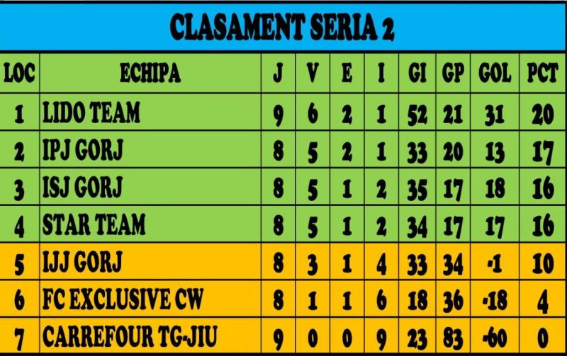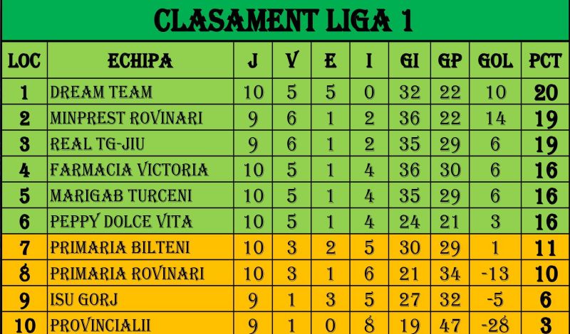Farmacia Victoria și Primăria Bîlteni au produs cel mai spectaculos meci al rundei. Farmacia a condus în permanență, 2-0, 3-1, 4-2 sau 5-3, dar cei de la Bîlteni au luptat și au reușit să obțină un punct, scor final 5-5. În Liga 2 au avut loc, de asemenea, jocurile din etapa a zecea. În Seria 2, Lido Team, liderul la zi, a trecut fără emoții de echipa Inspectoratului de Jandarmi Gorj, scor 9-3. La diferență mare s-a încheiat și jocul dintre Inspectoratul Școlar Gorj și Carrefour Târgu Jiu, profesorii gorjeni reușind să se impună cu scorul de 13-7. Meciul dintre Inspectoratul de Poliție Gorj și FC Exclusive Car Wash a fost amânat. În Seria 1, liderul FC Primăria Albeni își continuă marșul triumfal. Vineri, Răzvy Team a învins într-un meci din etapa 9, iar duminică a trecut la pas de FC Anna în derbiul rundei. Băieții de la Albeni au acum 27 de puncte din tot atâtea posibile și vor porni, cel mai probabil, de pe primul loc în faza de play-off. Răzvy Team, cu un lot mult îmbunătățit față de turul sezonului regular, a trecut, duminică, de Succes Team și s-a apropiat la un singur punct de locul 4, ultimul care asigură calificarea în Play-off, ocupat momentan de FC Anna. Grosbi Ursus a bifat prima victorie a sezonului în duelul cu Triton, scor final 7-2.