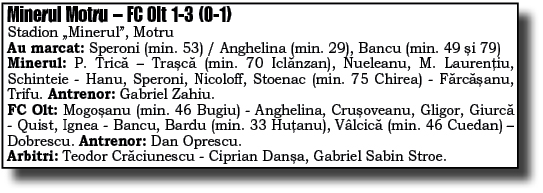Minerul Motru rămâne ultima în clasament, fără șanse reale de salvare, iar în etapa viitoare se va deplasa la Oradea, pentru un alt duel cu o echipă în suferință, FC Bihor.