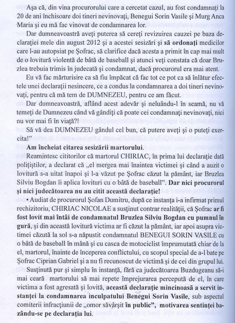 “Așa că, din vina procurorului care a cercetat cazul, au fost condamnați la 20 de ani de închisoare doi tineri nevinovați, Benegui Sorin Vasile și Murg Anca Maria și eu mă fac vinovat de condamnarea lor. Dar dumneavoastră aveți puterea să cereți revizuirea cauzei pe baza declarației mele din august 2012 și a acestei sesizări și să ordonați medicilor care l-au autopsiat pe Șofrac, să clarifice dacă acesta a primit în cap mai mult de o lovitură violentă de bâtă de baseball și atunci veți constata că doar Bruzlea trebuia trimis în judecată și condamnat, dacă procurorul era mai atent. Eu vă fac mărturisire ca să fiu împăcat că fac tot ce pot ca să înlătur efectele unei declarații nesincere, ce a condus la condamnarea a doi tineri nevinovați, pentru că mă tem de DUMNEZEU pentru ce am făcut”, se arată în declarația lui Chiriac, citată de autor în carte la pagina 70.