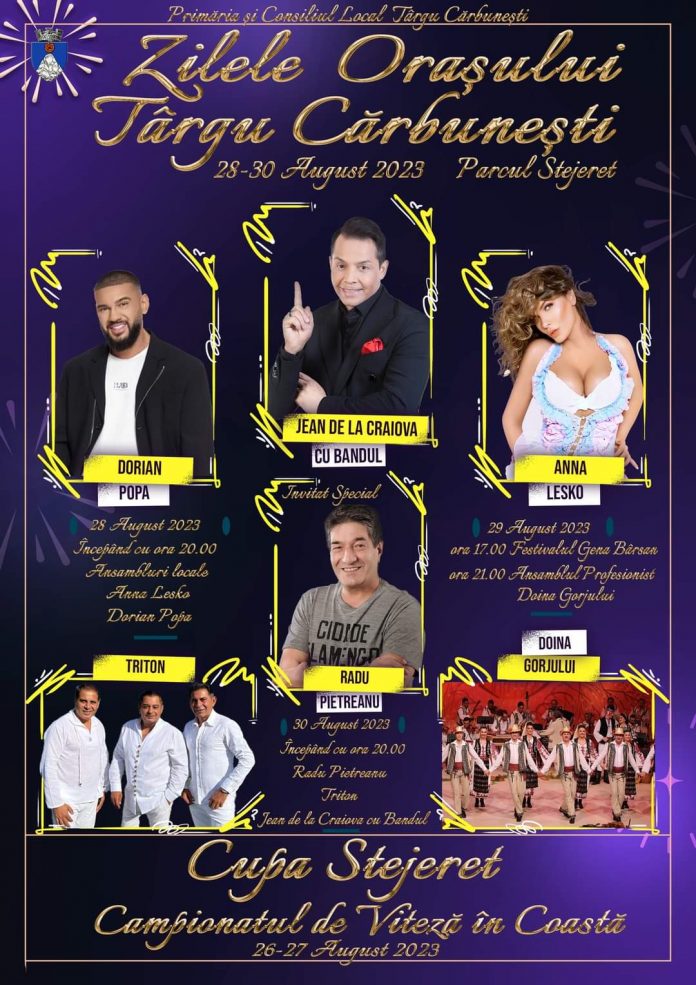 Ediția din acest an a Zilelor Orașului Târgu-Cărbunești va avea loc în perioada 28-30 august, în Parcul Stejeret din localitate. În prezența locuitorilor din oraș și nu numai, vor urca pe scena amplasată Jean de la Craiova, Dorian Popa, Anna Lesko, formația Triton, Ansamblul Doina Gorjului, dar și umoristul Radu Pietreanu, cunoscut publicului din producția ”Vacanța Mare”.