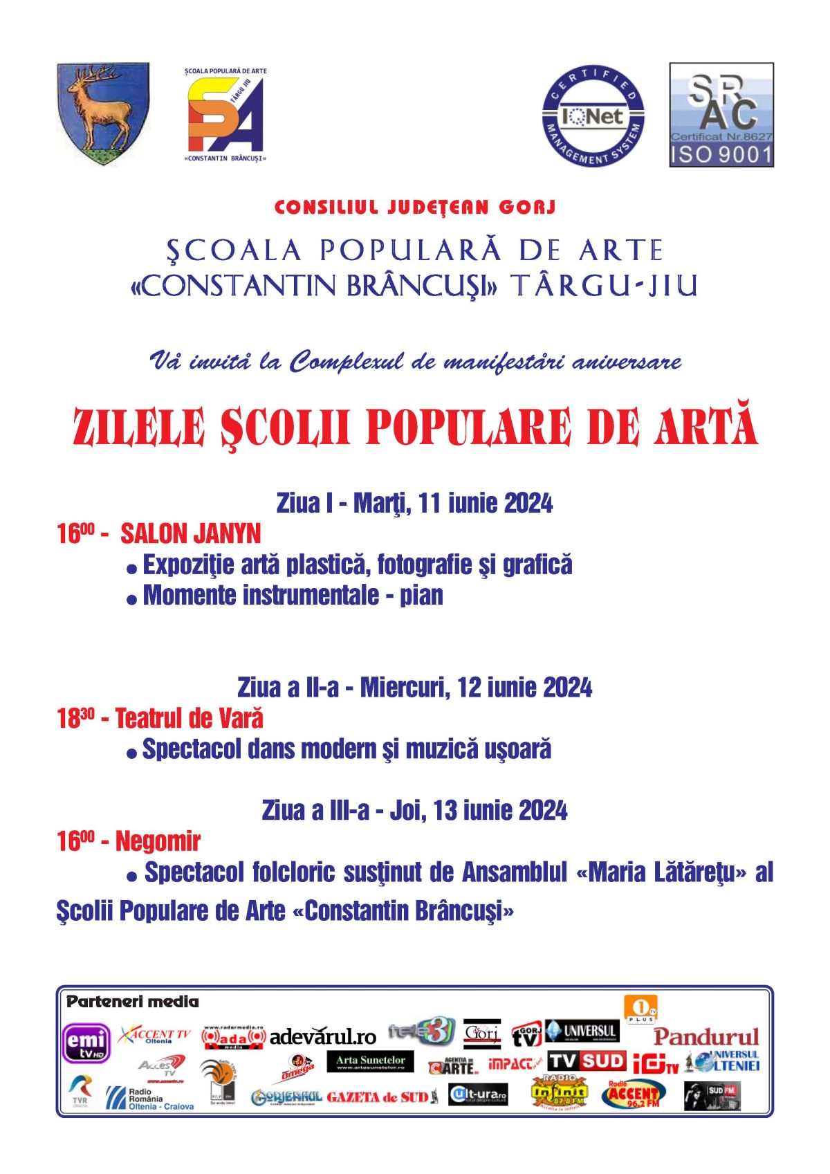 În perioada 11-13 iunie 2024, Școala Populară de Arte ”Constantin Brâncuși” Târgu Jiu, instituție subordonată Consiliului Județean Gorj, organizează ”Zilele Școlii Populare de Arte”, un complex de manifestări artistice dedicat și deschis cursanților instituției noastre.