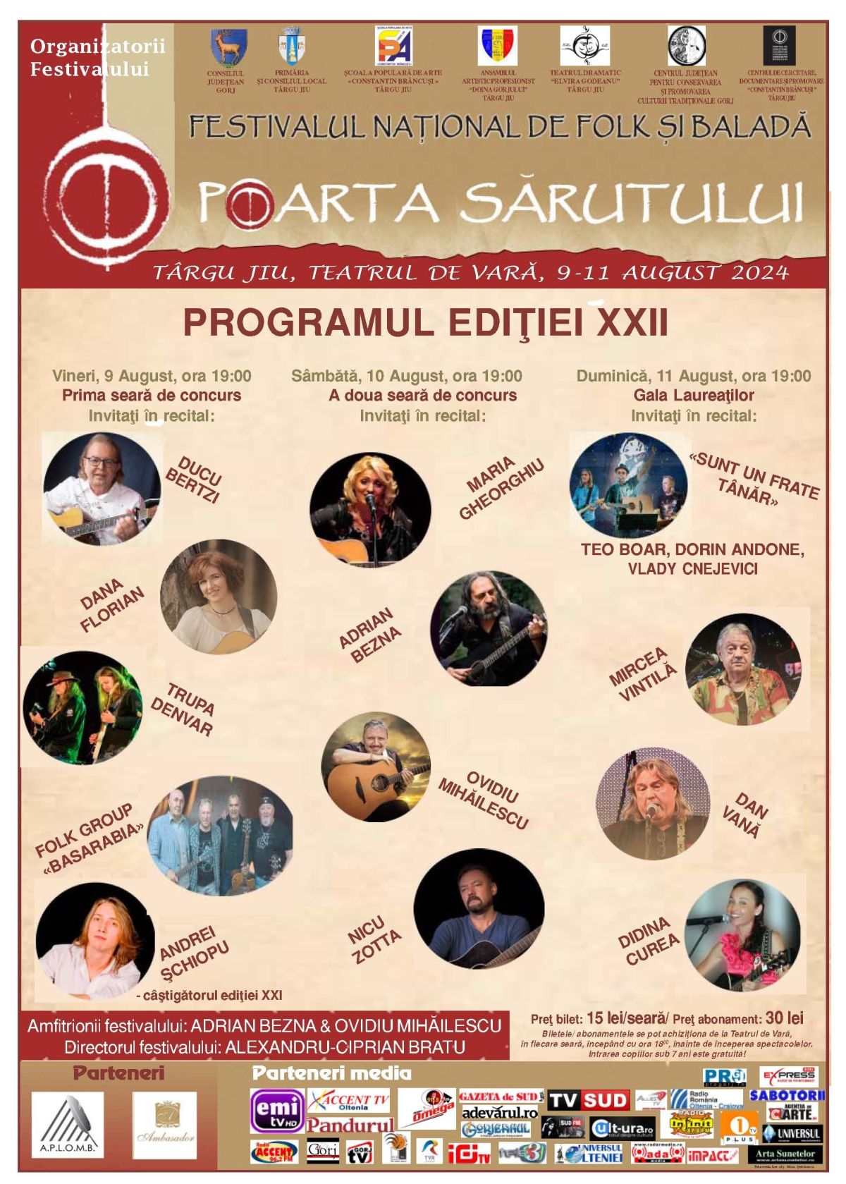 Festivalul Național de Muzică Folk și Baladă „Poarta Sărutului” se va desfăşura în perioada 9-11 august 2024, la Târgu Jiu. Evenimentul este organizat de către Primăria și Consiliul Local al Municipiului Târgu Jiu, Consiliul Judeţean Gorj, Școala Populară de Arte „Constantin Brâncuși” Târgu Jiu, Centrul Municipal de Cultură „Constantin Brâncuși”, Ansamblul Artistic Profesionist „Doina Gorjului”, Teatrul Dramatic „Elvira Godeanu” și Centrul Județean pentru Conservarea și Promovarea Culturii Tradiționale Gorj în colaborare cu Asociaţia „Proiect pentru o Lume a Oamenilor Mai Buni”.
