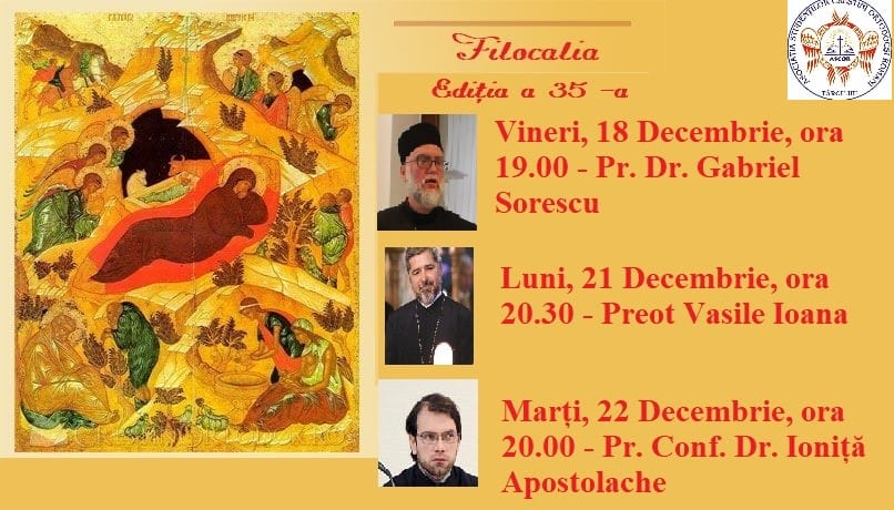 Asociația Studenților Creștini Ortodocși Români (ASCOR), filiala Târgu Jiu, a anunțat că, începând de vineri, 18 decembrie, se va desfășura cea de-a 35-a ediție a ,,Filocaliei”. Conferințele vor avea loc online, pe pagina de Facebook a ASCOR Târgu-Jiu, după următorul program: vineri, 18 decembrie, ora 19.00 – Pr. Dr. Gabriel Sorescu, luni, 21 decembrie, ora 20.30 – preot Vasile Ioana, marți, 22 decembrie, ora 20.00 – Pr. Conf. Dr. Ioniță Apostolache.